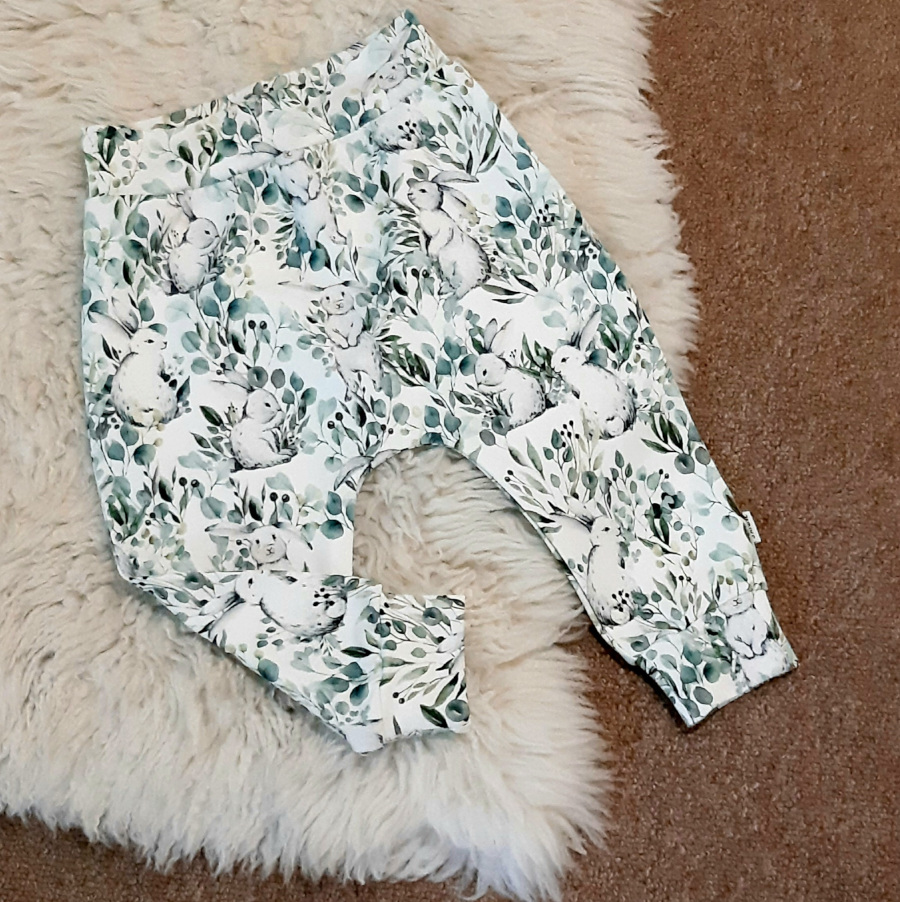 Pisikeste jänestega stiilsed baggy stiilis püksid HOP. Pehmest naturaalsest kangast dressid sobivad kõigile ja kõikjale. Kirju muster on pidulikult valge, kuid piisavalt kirju praktilistemateks tegevusteks. Alumised otsad ja ülemine äär on võimalik tagasi keerata. Püsid sobivad komplektiks PLAY pusaga.