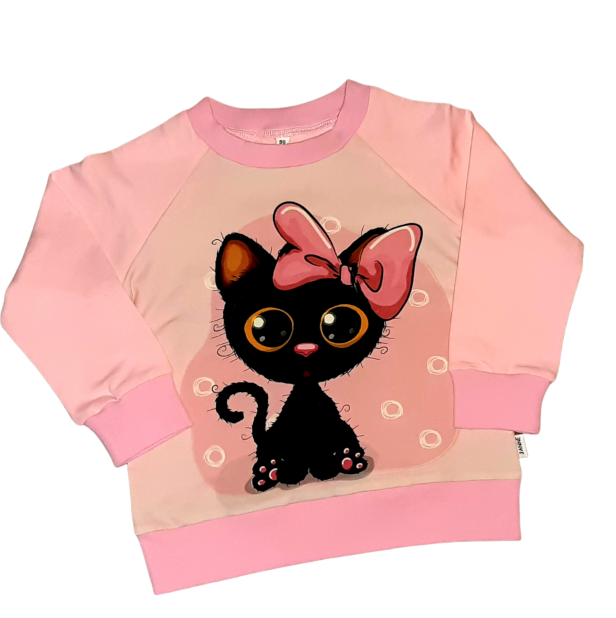 Armas ja salapärane must kass roosamanna sees ehk äge roosa pusa JOHI. See klassikaline dressipluus lapsele paneb päeva särama. Kampsuni moodi riietus sobib aastaringseks kasutamiseks nii tuppa, kui õue.