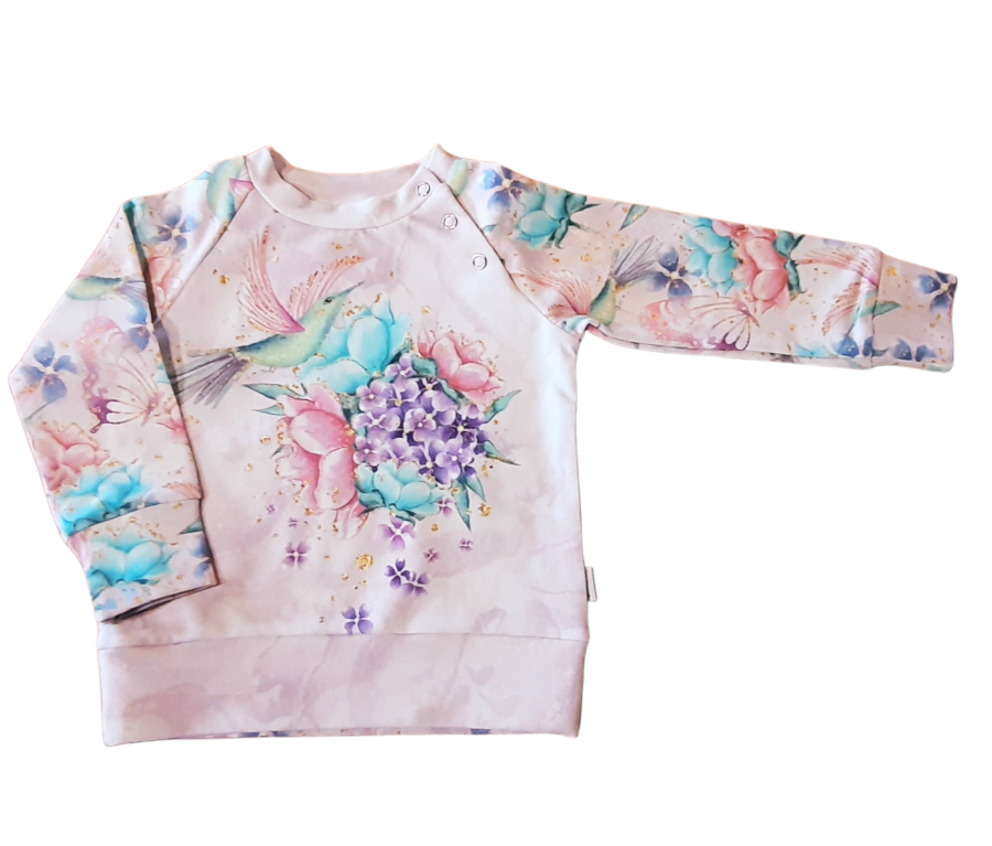 Imeliselt ingellikult õrn ja roosa pusa PLAY. Kaunis klassikaline dressipluus võib olla väga luksuslik ja kaunis. See pluusike on eest roosakas-lilla ingel-linnu pildiga. Varrukad ja selg on samas stiilis lillede ja väiksemate lindudega kangas. Õrn ja kaunis väikesele printsessile. Riietamise hõlbustamiseks on õlale lisatud trukk-kinnised.