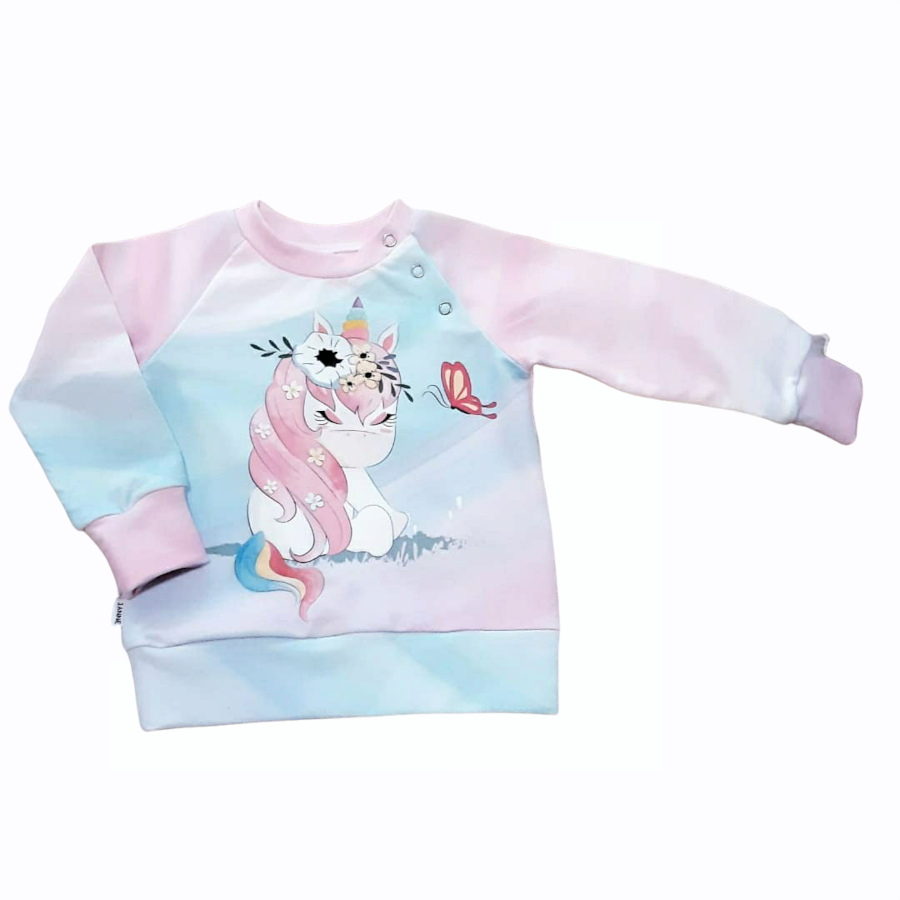Nii armas, malbe, üksik, armastatud, hoitud... Ükssarvik roosas vahus pusal PLAY on imeline kooslus ja ainulaadne välimus. Pisikese inimese dressipluus on varustatud trukkidega ühel õlal, et seda saaks kergesti ja kiiresti selga ning seljast ära saada.