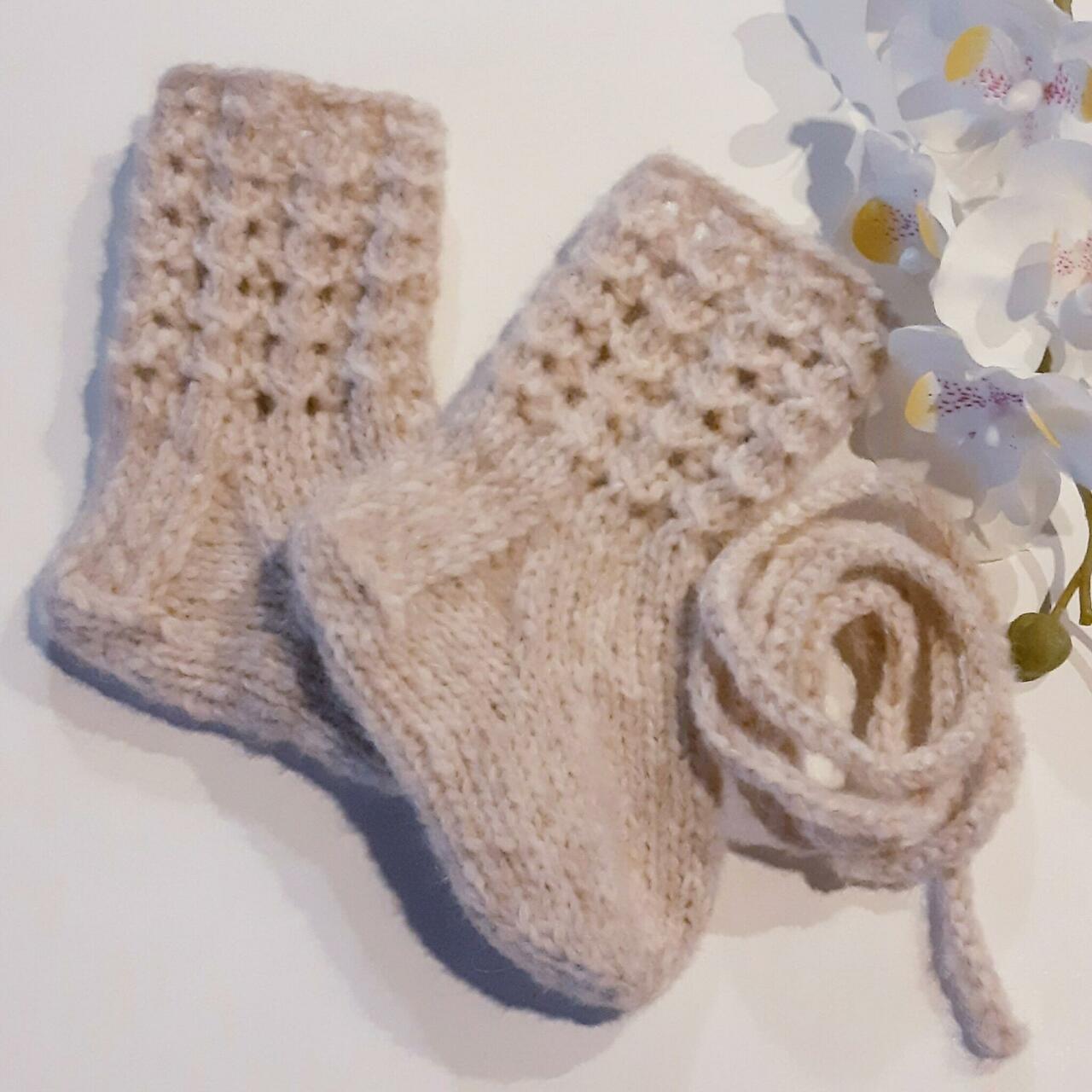 Beezist lõngast sokikesed on ülevalt pitsilise koekirjaga. Lisame kaasa nöörikesed, mille saab vajadusel põimida läbi esimese pitsilise rea aukude, et magamiskotis või vankris teki all need jalast ei tuleks.